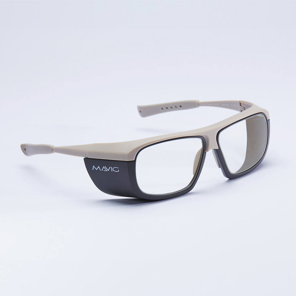 Protección continua contra la radiación: de la nariz a la sien. Mavig fabrica varios modelos de gafas de protección radiológica para proteger de forma óptima los ojos del usuario frente a la radiación dispersa procedente de todos los ángulos de incidencia. Este requisito se ha tenido en cuenta de forma eficaz en el diseño de las gafas mediante cristales protectores contra rayos X de gran superficie y dos zonas de protección contra la radiación lateral